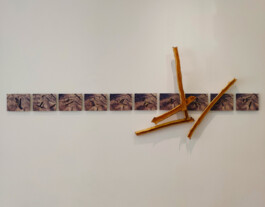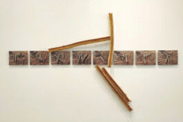 Interférence 4 (2005) — 5 branches de noisetier creusées, de 27 à 43 cm. 10 photographies (20 x 30 cm) tirées sur aluminimum. 100 x 400 cm. Photo : Daniel Le Nevé.